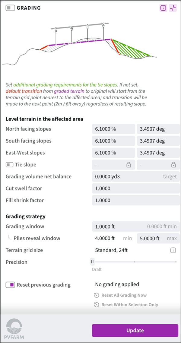 - Tie Slope dictates how the grading will transition from where the grading occured and the non graded area of the terrain.