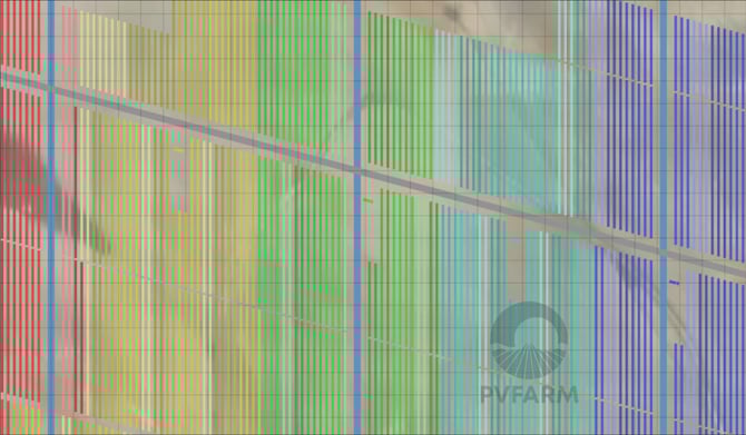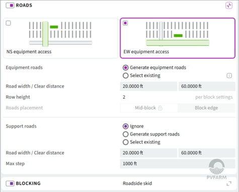 PVFARM supports both E-W and N-S roads for equipment access. Inverter placement relative to the roadway is identified in the Blocking -> Equipment Placement.