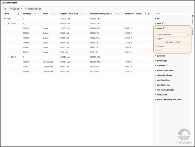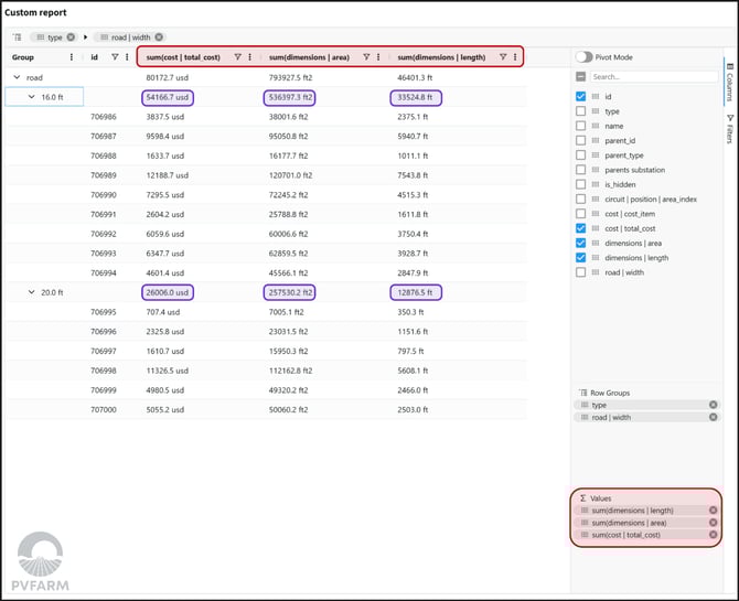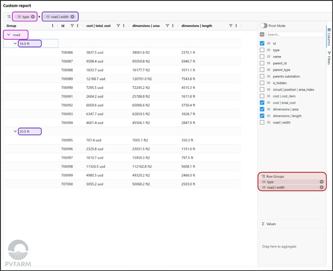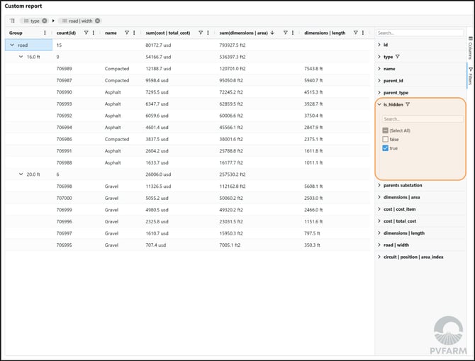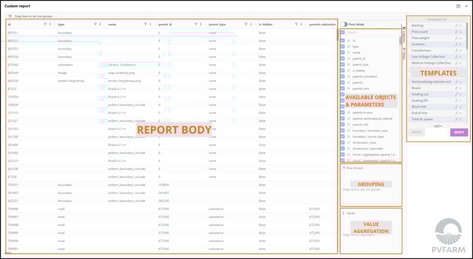 Think of your layout as a box of fruits. Each object—trackers, boundaries, roads, combining boxes, or wires—is a type of “fruit” with unique parameters. A custom report is like sorting and labeling that box: