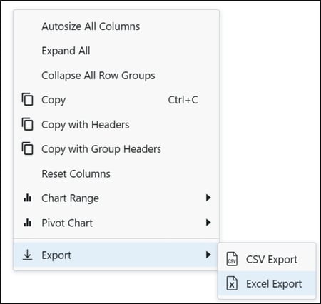 - Export to Excel- once your report is set, expand all row groups and either right click and select export, or select the export button in the top right corner.